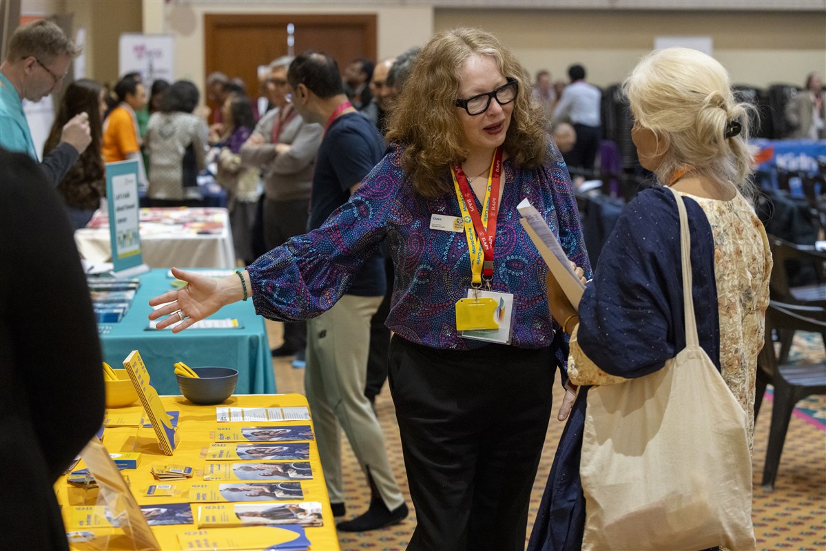 An attendee discussed health-related questions with a stall representative during the Health Marketplace.