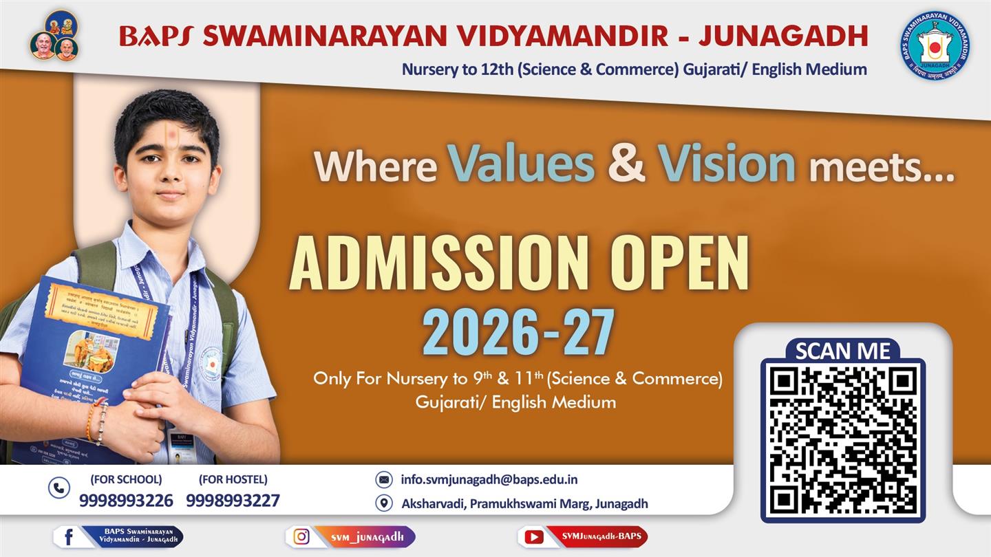 આજે, બી.એ.પી.એસ. સ્વામિનારાયણ વિદ્યામંદિર – જૂનાગઢમાં આધુનિક શિક્ષણ સાથે સંસ્કાર, નૈતિકતા અને જીવનમૂલ્યોનું પણ માર્ગદર્શન મળે છે—જે વિદ્યાર્થીઓને સારા અને જવાબદાર નાગરિક બનાવે છે.