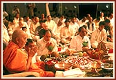 After Swamishri's morning puja a collective home visit (samuh padhramani) ritual was held. The devotees performed puja and arti of Thakorji and had personal darshan of Swamishri.