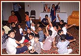 At 10.30am, Swamishri attended the Daycare assembly of the shibirites' children between the ages of one to ten. Swamishri asked questions regarding the names of the murtis and an interesting interaction followed. (See Photo Story)