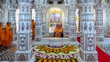 After his morning puja, Swamishri performed the murti pratishtha ritual of pujan and arti of Shri Akshar Purushottam Maharaj, Shri Radha Krishna Dev and Guru Parampara for BAPS hari mandirs in the villages of Sarkhej and Nenpur.