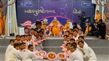 The murtis of Shri Harikrishna Maharaj were seated in a decorated, motorised chariot and was manoeuvered around the assembly hall. In conclusion, Swamishri performed the Rath Yatra celebration arti.