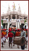 The evening celebration assembly was interlaced with speeches and dance. Aksharvatsal Swami, Viveksagar Swami and Tyagvallabh Swami spoke about the divine life of Bhagwan Shri Krishna. BAPS teenagers performed a lively traditional dance based on the bhajan “Govinda ãlã re…”, describing Krishna’s pastime as a child. Thereafter Swamishri was honoured with garlands. Finally at 9.40 p.m. Swamishri blessed the assembly, “We celebrate such festivals because of our devotion to God, to please him, to experience his divine bliss and to attain his divine abode. To listen and remember his divine incidents is also a means to attain moksha. When we attain God and his realized Sadhu we experience inner peace. Material things or pleasures do not provide inner peace, but cause turmoil.”Swamishri concluded his blessings at 10.00 p.m. and performed arti. Thereafter he devotionally rocked Thakorji in a decorated hindolo amidst the singing of “Nand gher ãnand bhayo…”.