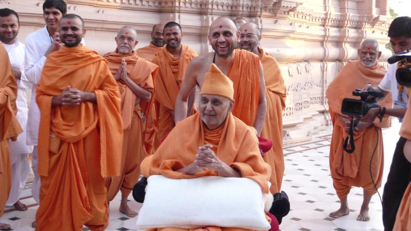 Swamishri engaged in darshan of Shastriji Maharaj's room