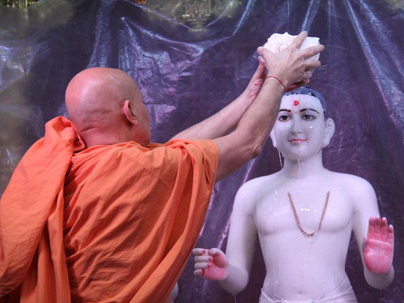 On Patotsav day Pujya Viveksagar Swami performs abhishek rituals of Thakorji