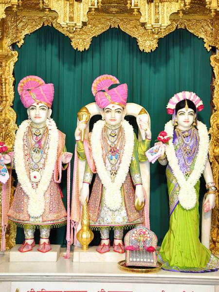 Prior to performing his morning puja Swamishri performed the pratishtha rituals of pujan of murtis of Shri Akshar-Purushottam Maharaj, Shri Radha-Krishna Dev, Hanumanji and Ganapatiji for the new BAPS hari mandir in Nandurbar, near Dhuliya.