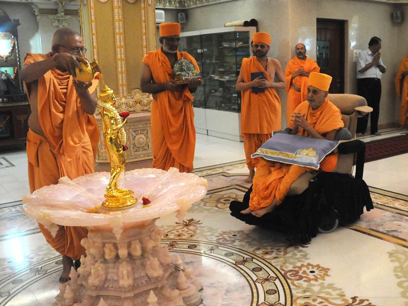 Swamishri engaged in darshan of Shri Nilkanth Varni abhishek murti...
