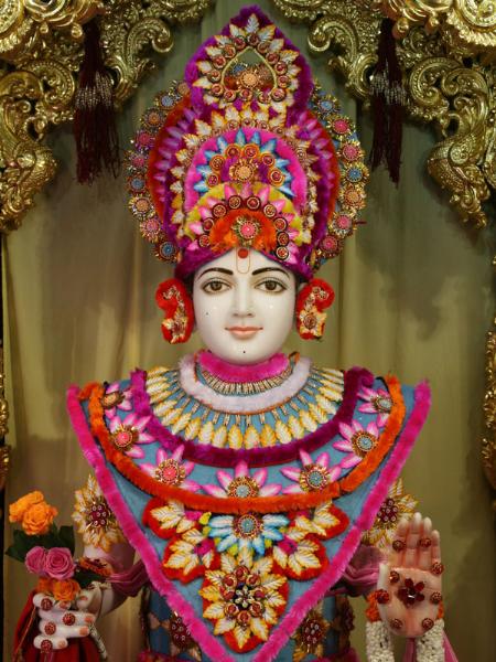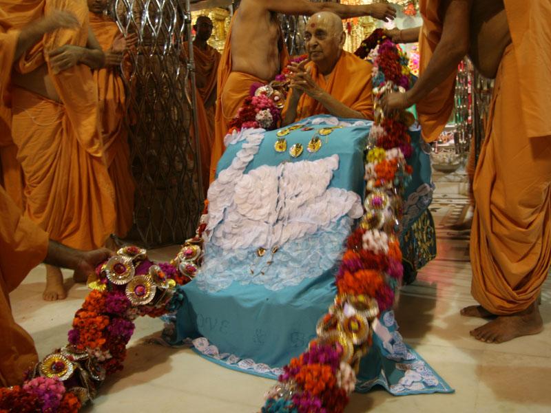 Swamishri arrived for darshan in the abhishek mandap and also appreciated the variety of hindolas made by kishores and kishoris of Mumbai for Shri Harikrishna Maharaj. After Thakorji’s darshan Swamishri blessed the devotees who had come from far off places to celebrate the festival of Raksha Bandhan. Senior sadhus offered a shawl and garland of rakhdis to Swamishri. Swamishri sanctified the rakhdis, which were later tied by sadhus on every devotee’s wrist.