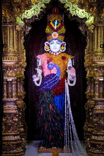 An ambience of a diksha ceremony was set up before Thakorji in the central sanctum of the mandir. Shriji Maharaj was shown engaged in initiating Mulji Bhakta into Gunatitanand Swami.