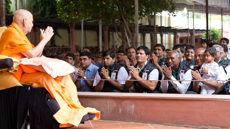 Swamishri blesses devotees doing seva as security volunteers