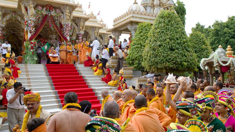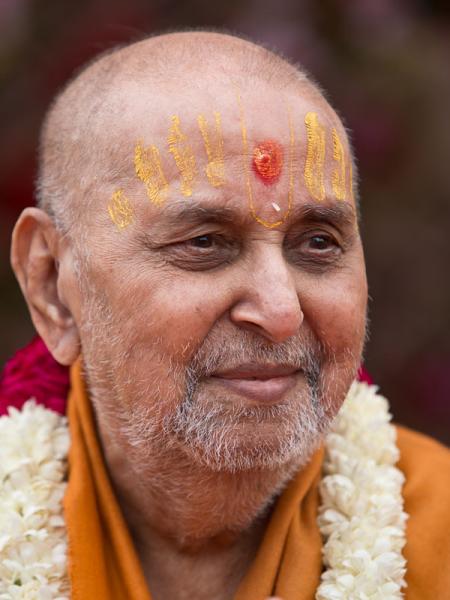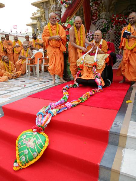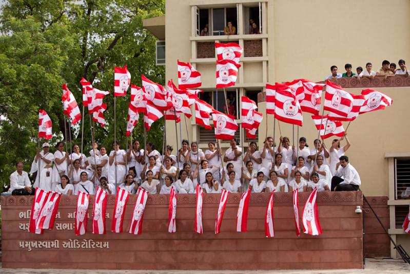 On 21 June 2012, thousands of devotees gathered at the BAPS Mandir in Ahmedabad to celebrate the Rath Yatra festival in the divine presence of Pramukh Swami Maharaj. As Swamishri emerged from the lift onto the mandir precincts, he was greeted by two balaks attired as Lord Jagannathji. Then, as he proceeded towards the main mandir, he was flanked by balaks in sadhu costumes playing drums. In front was Shri Harikrishna Maharaj seated on a small intricately decorated motorized rath, which Swamishri operated by remote control. In the background, vibrant bhajans and music enriched the festive ambience. Every vantage point had been occupied by the devotees for darshan. On the front podium of the mandir, Swamishri performed pujan and arti of Shri Harikrishna Maharaj. Then, the murti of Shri Harikrishna Maharaj was placed in the large, decorative, hand-pulled rath on the mandir grounds. Swamishri then waved a BAPS flag from the mandir podium to initiate the Rath Yatra. Senior and other sadhus pulled the rath around the perimeter of the mandir as Swamishri looked on. In front of the rath were dancing groups of children and youths in traditional costumes and devotees in traditional attire. The mandir grounds echoed with melodious bhajans and joyous singing as thousands of devotees enjoyed this divine darshan.