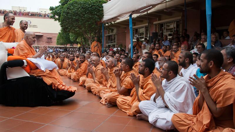 Sadhus doing darshan of Swamishri in the mandir pradakshina