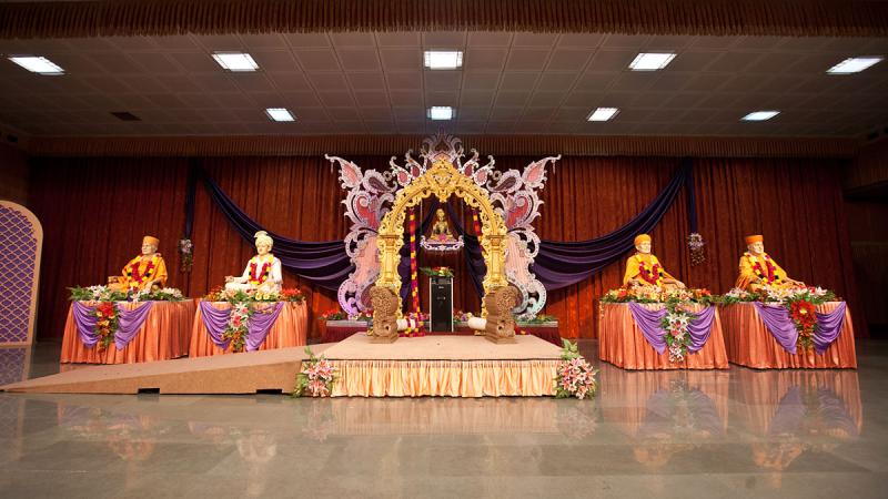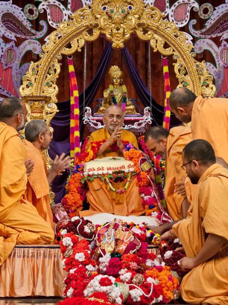 In the evening satsang assembly Swamishri gave Tejas Thakor of Navsari the parshad diksha and named him Valmik Bhagat. Swamishri was honoured with garlands by senior sadhus. Thereafter youths enacted the incident of Hira Mukhi’s courage in the time of Shastrji Maharaj on the assembly stage.