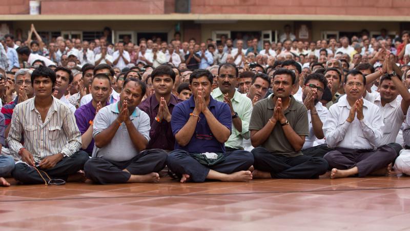 Sadhus and devotees doing darshan of Swamishri