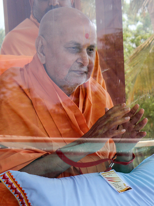 Swamishri greets devotees with 'Jai Swaminarayan'