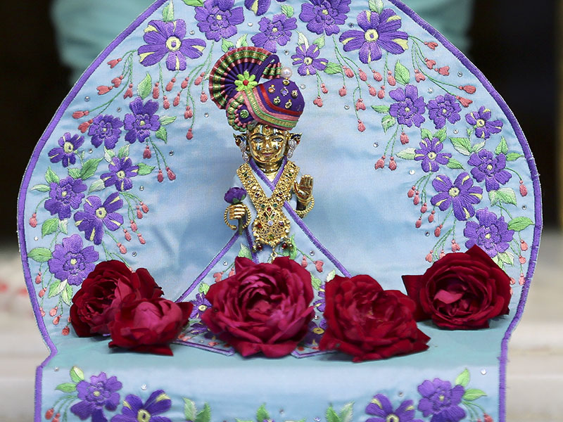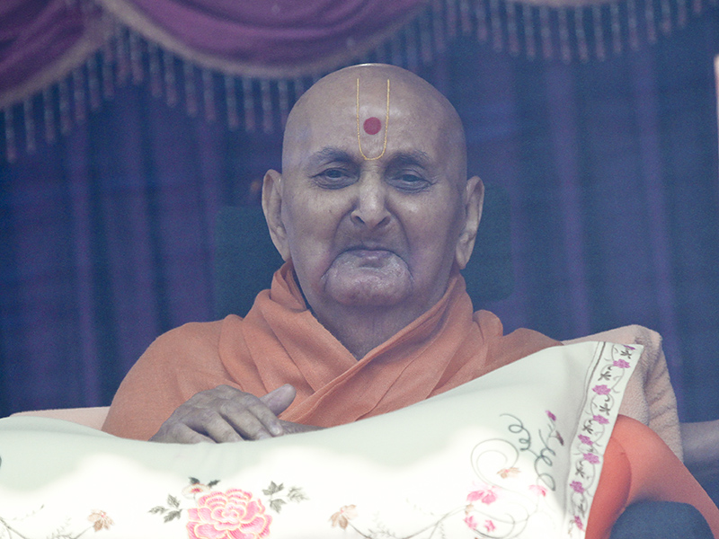 HH Pramukh Swami Maharaj arrives in balcony and waves a chhadi