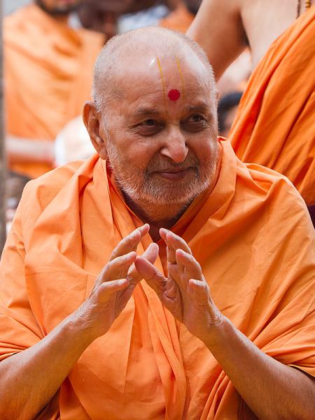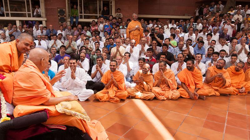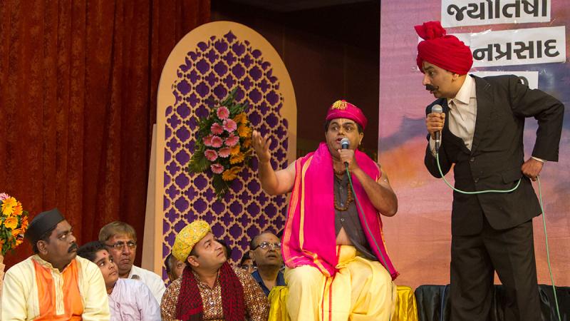 Swamishri arrived in the mandir auditorium for the Sunday satsang sabha. A skit, ‘Jyotishi’, was performed by youths portraying the theme of having resolute faith in God. Then Swamishri gave darshan to all from the main stage and returned to his quarters.