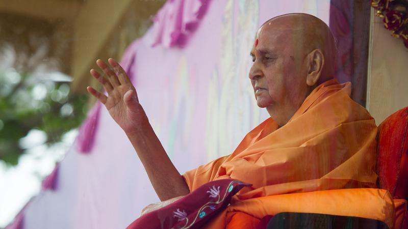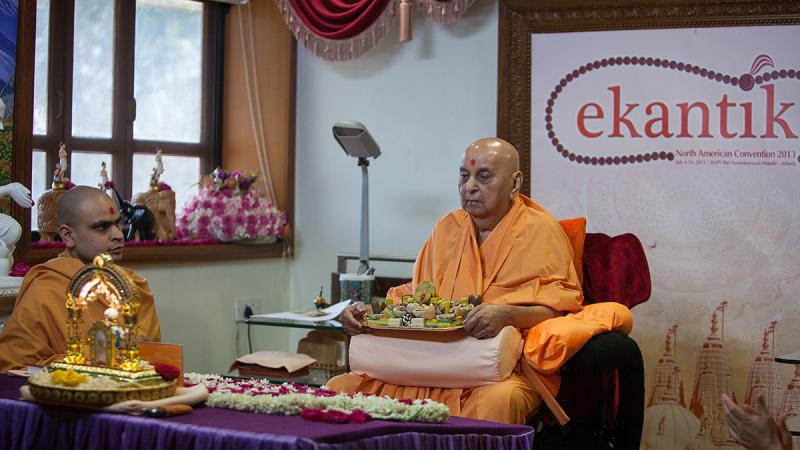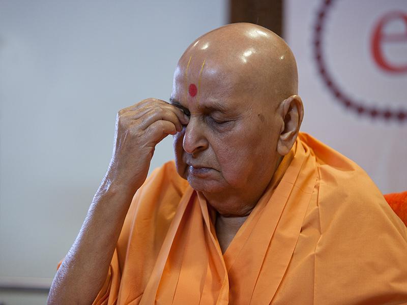 The festival assembly commenced in the mandir precincts at 9.00 a.m. with dhun and prayer. Devotees from India and abroad were seated in the assembly. Speeches praising Bhagatji Maharaj’s life were presented by Viveknidhi Swami, Yagneshwar Swami and Viveksagar Swami. Swamishri came to the ‘Akshar Jharukho’ (glass cabin) to give darshan to all. A bhajan on Bhagatji Maharaj, ‘Derie dankã vãge, Bhagatjini derie dankã vãge...’ was sung by sadhus. Swamishri rang a bell along with the bhajan. Then Pujya Viveksagar Swami honoured Swamishri with garlands. Swamishri blessed all.