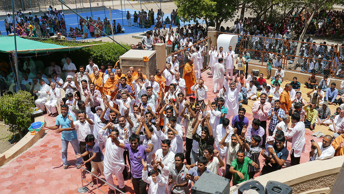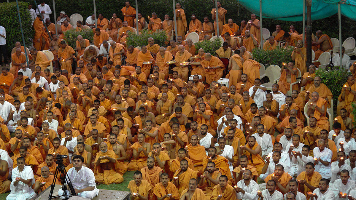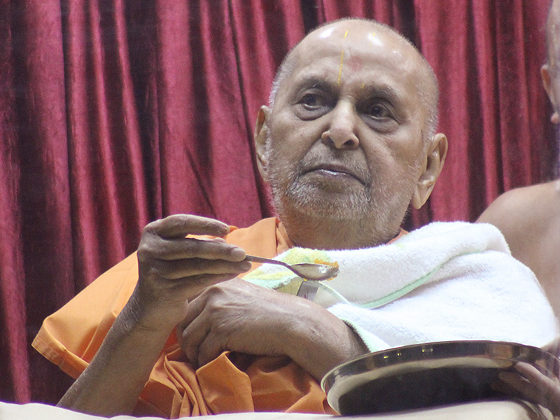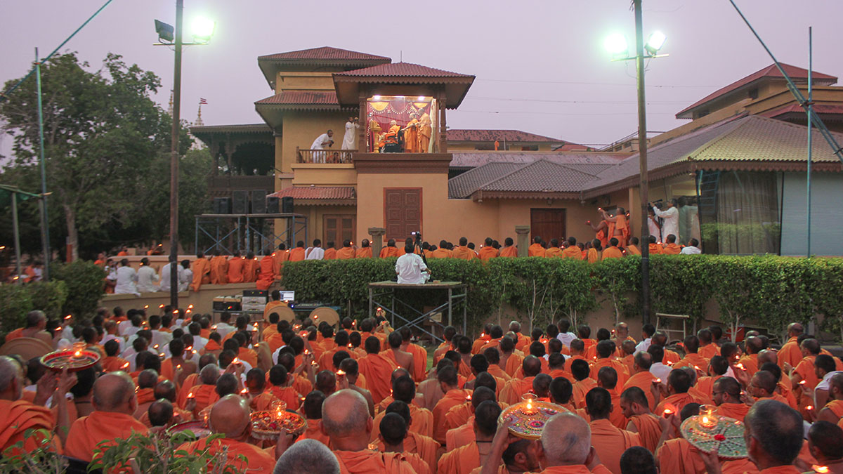 At 7.20 p.m. Swamishri gave darshan to all from ‘Akshar Jharukho’. He also performed arti of Shri Harikrishna Maharaj alongwith all the sadhus seated on the ground below. Thereafter the ashtaks were sung. Then Swamishri offered thal to Harikrishna Maharaj while “Jamo thãl…” was sung by all. The sadhus and devotees requested and prayed to Swamishri to have some shiro. Swamishri took some shiro to please all and blessed all.