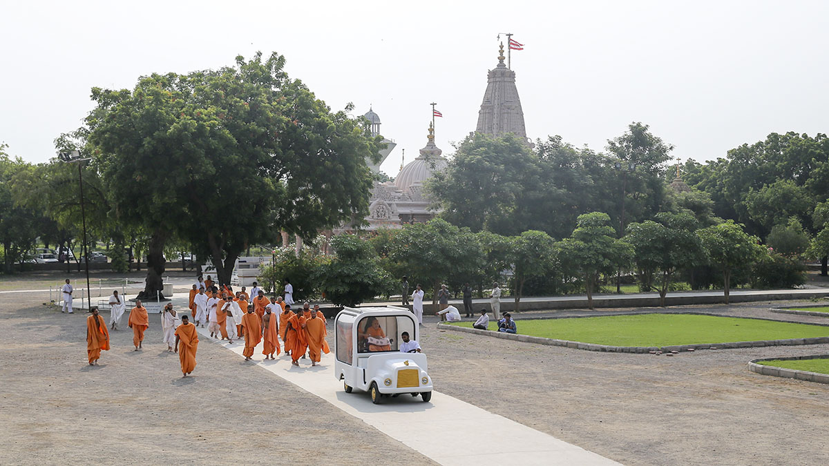 Swamishri arrives in the mandir grounds in the evening with Shri Harikrishna Maharaj