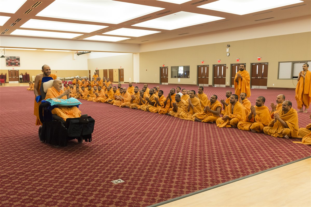 Swamishri greets all with 'Jai Swaminarayan'