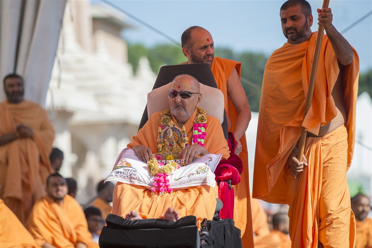 Swamishri arrives in Akshar Vatika with Shri Harikrishna Maharaj