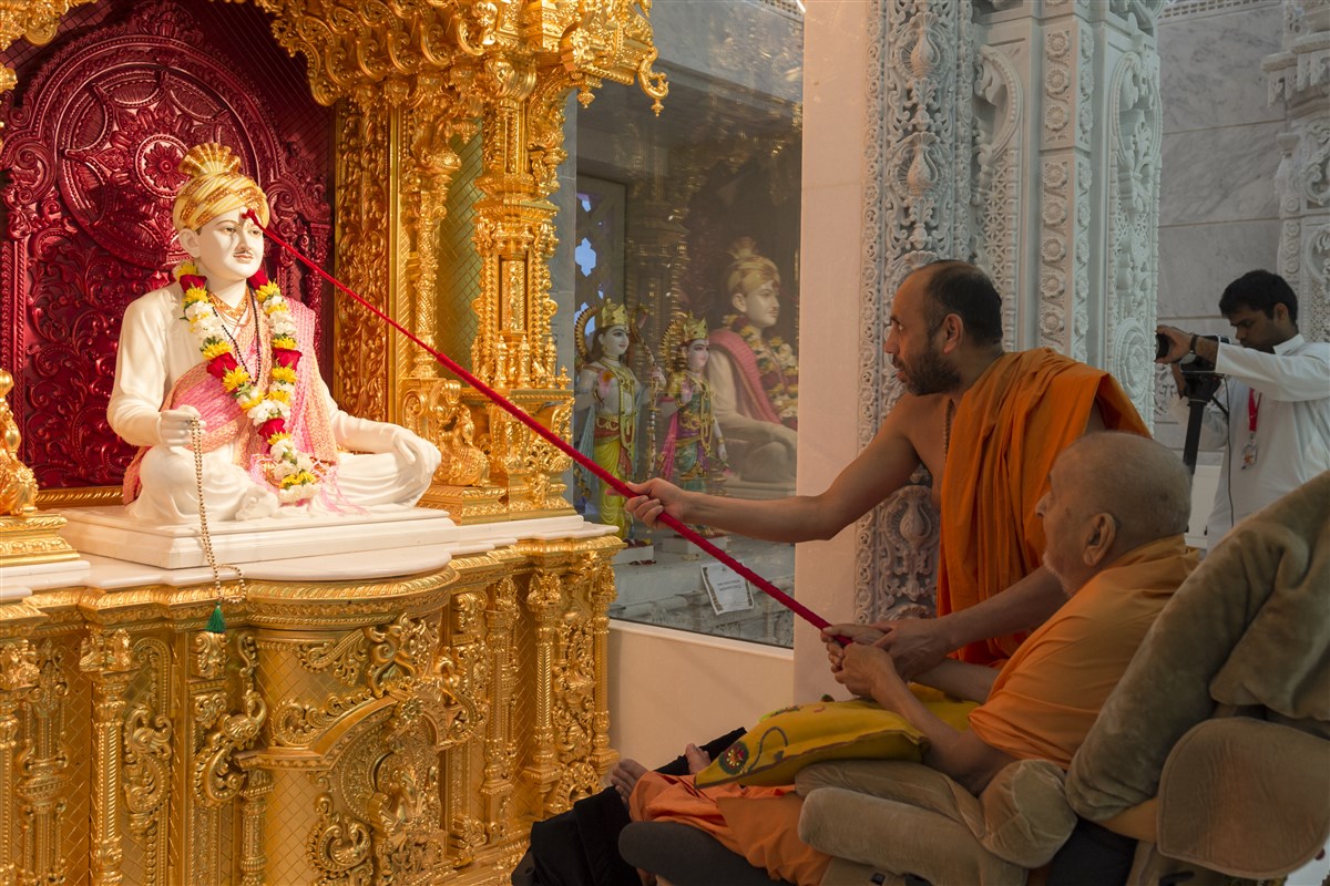 Pujya Keshavjivan Swami (Pujya Mahant Swami) does chandlo to Swamishri