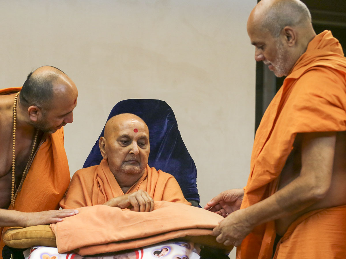 Swamishri reverentially touches cushions used by Yogiji Maharaj