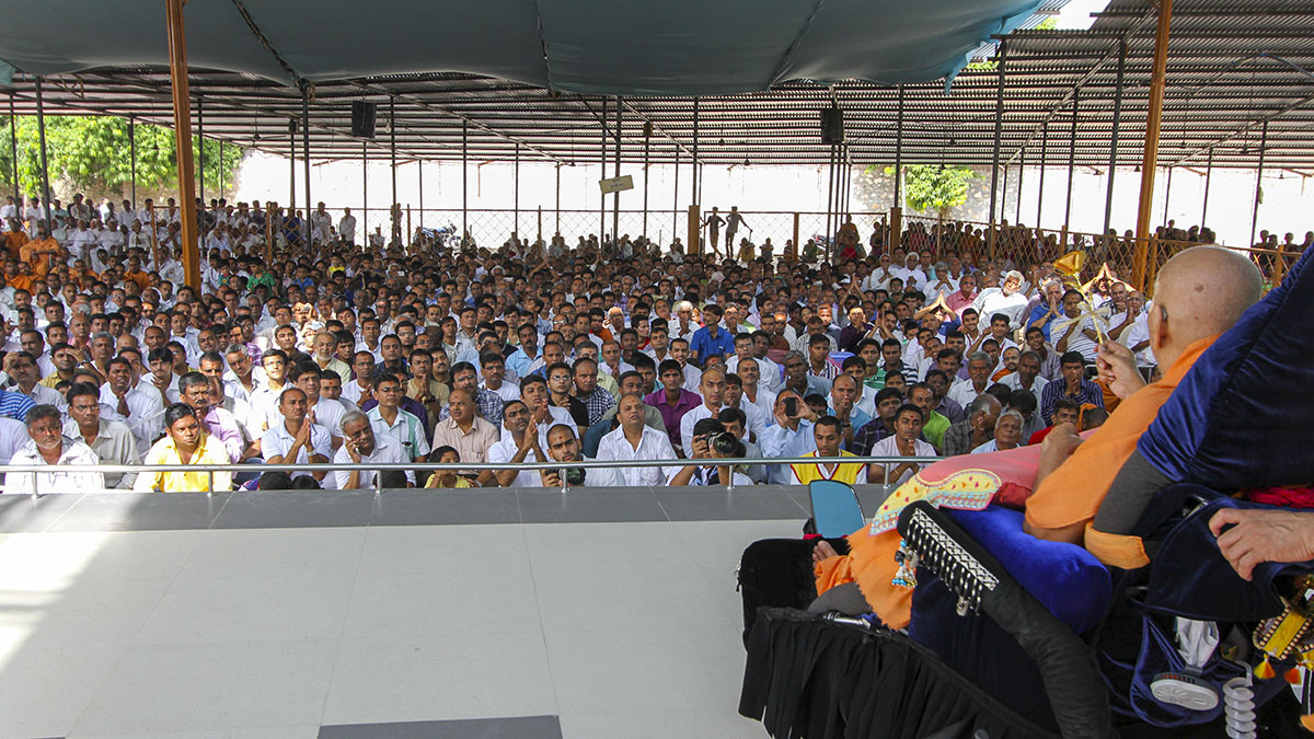 HH Pramukh Swami Maharaj greets sadhus with 'Jai Swaminarayan' after his morning puja