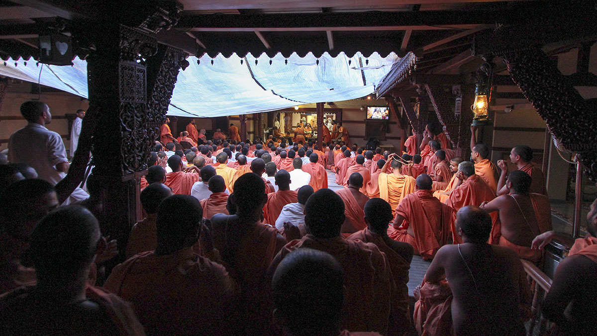 Sadhus and devotees doing darshan of Swamishri