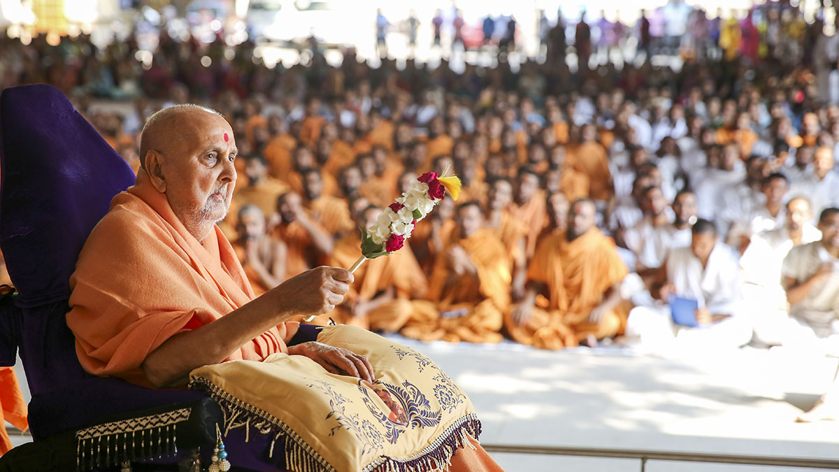 Swamishri greets devotees with 'Jai Swaminarayan'