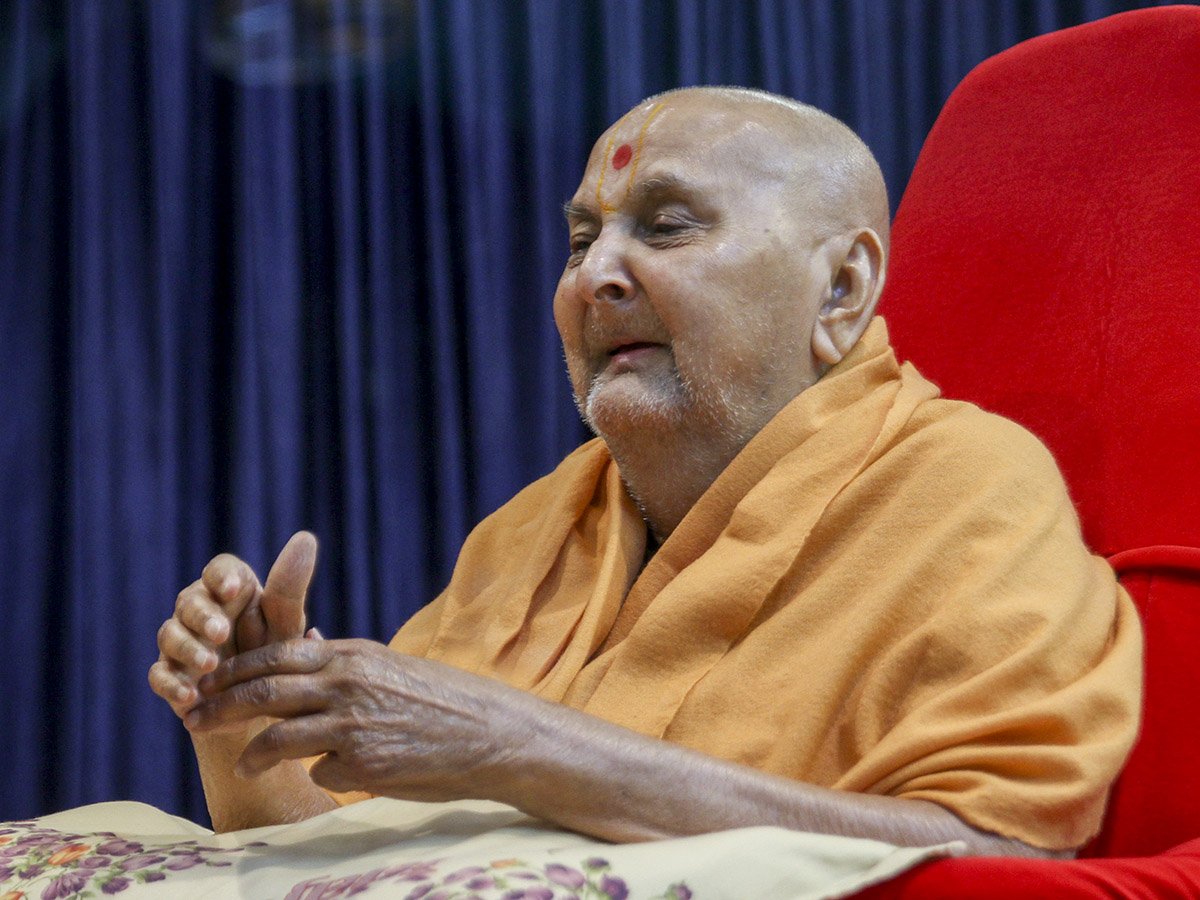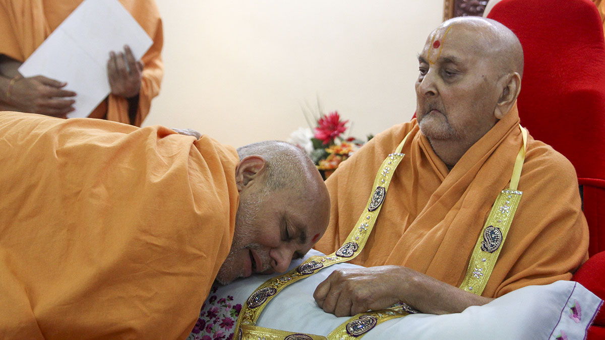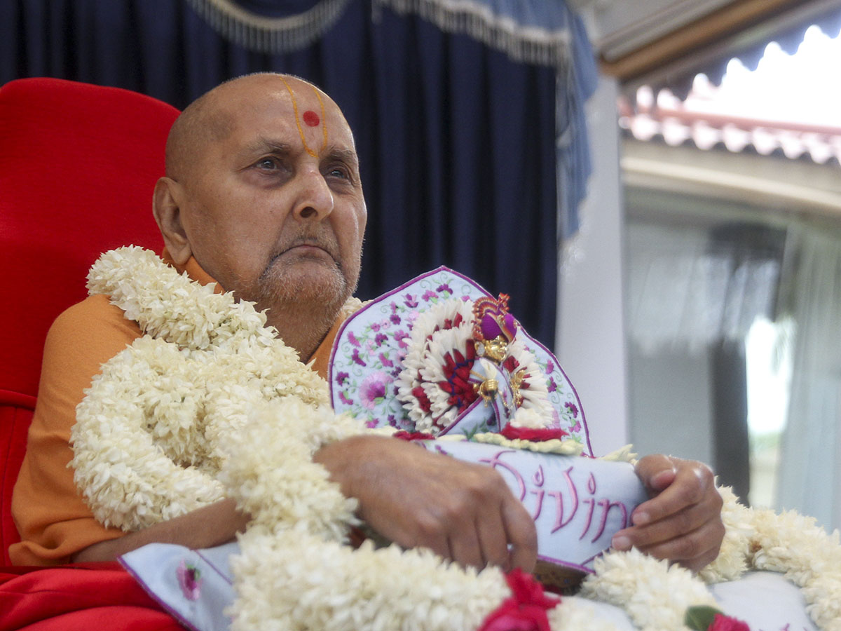 Swamishri arrives in the mandir grounds in the afternoon with Shri Harikrishna Maharaj