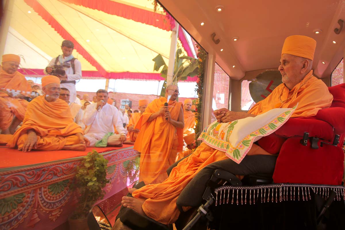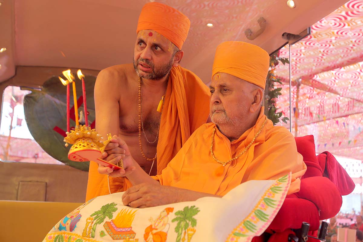 Swamishri greets Pujya Tyagvallabh Swami with 'Jai Swaminarayan'