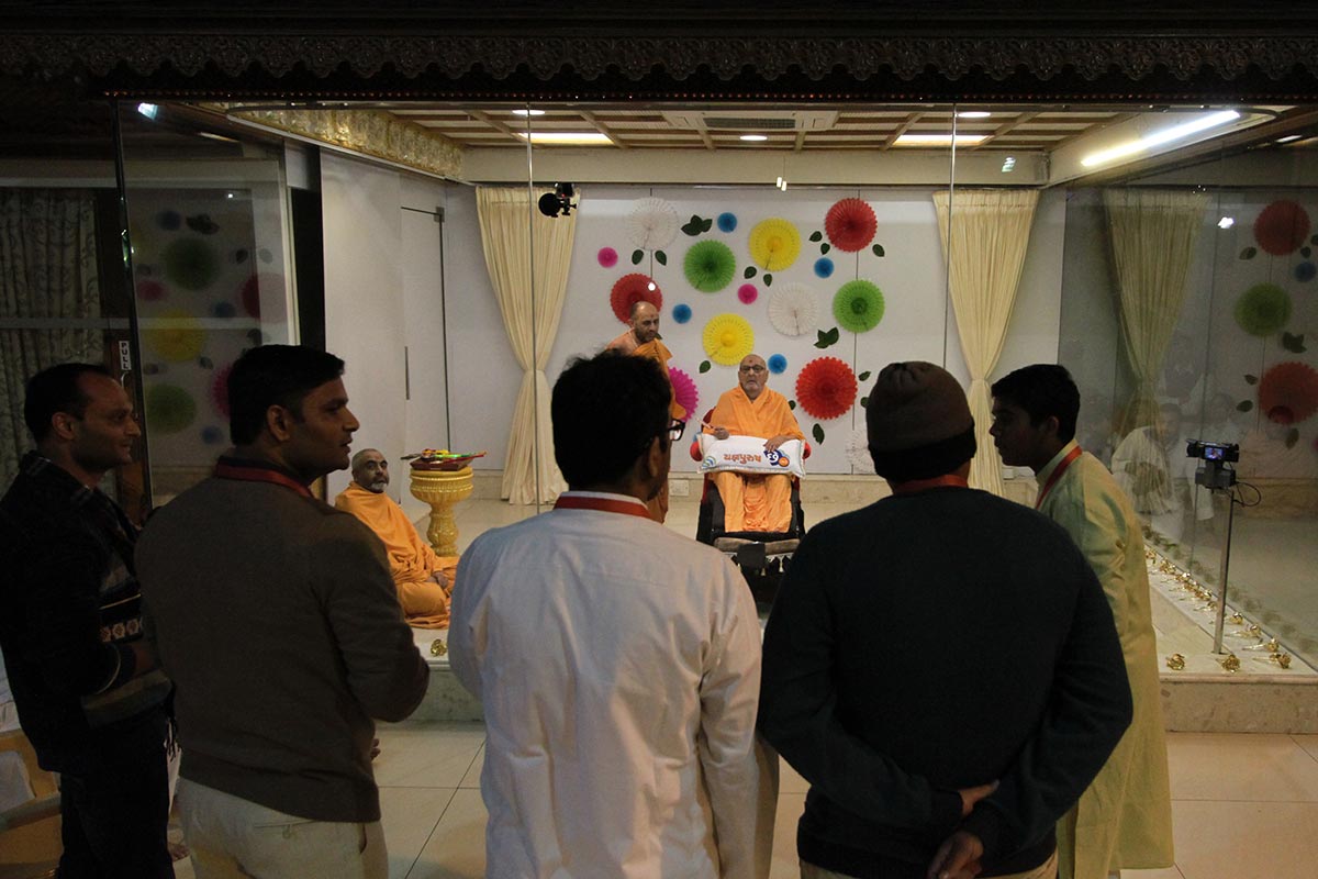 Sadhus and devotees doing darshan of Swamishri