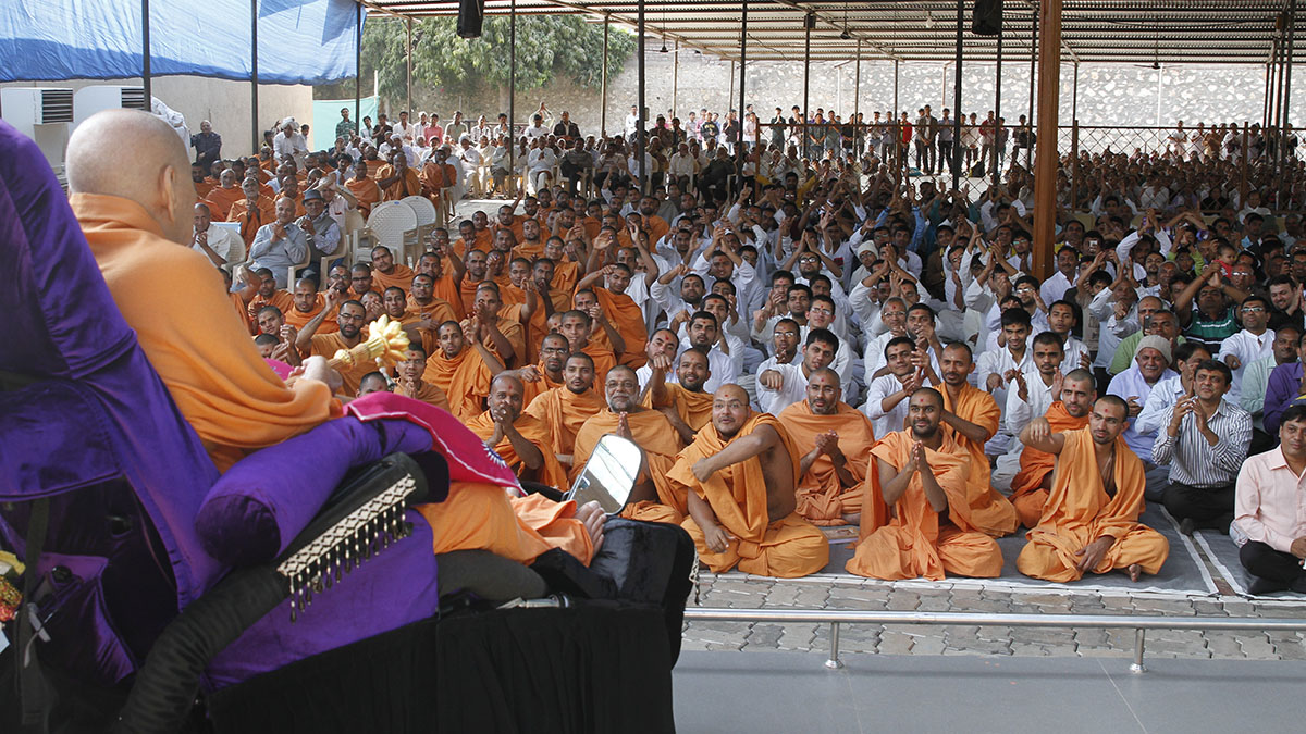 Sadhus and devotees doing darshan of Swamishri