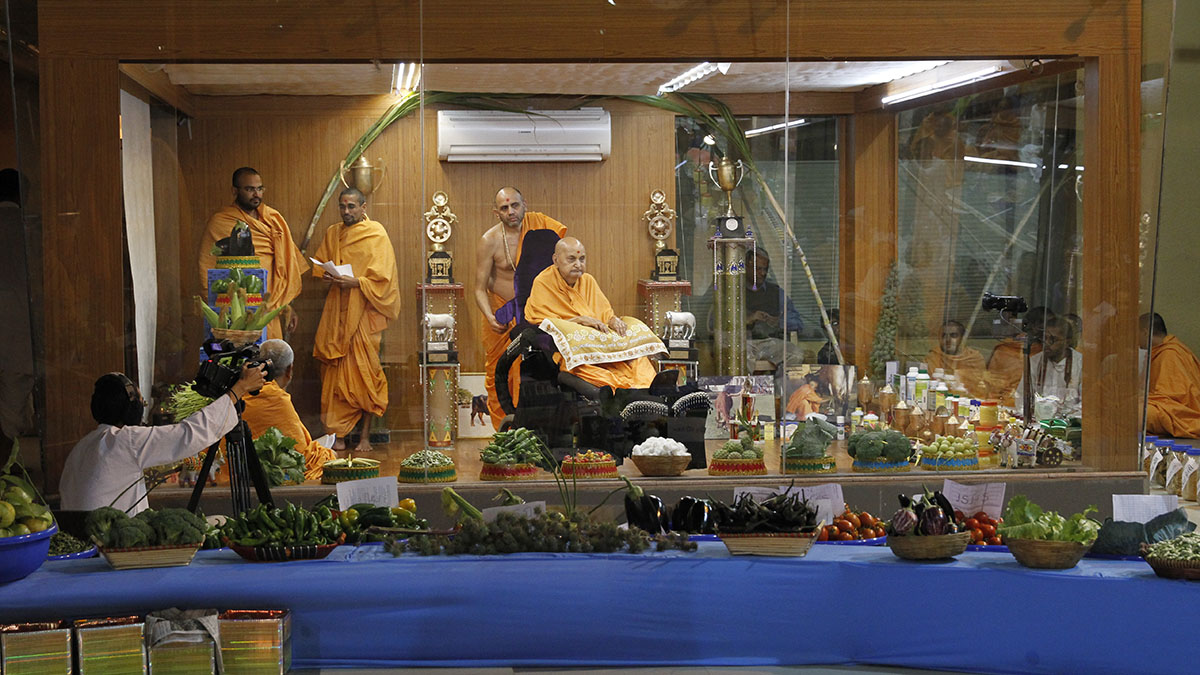 Swamishri sanctifies vegetables produced in the mandir farms in and around Sarangpur