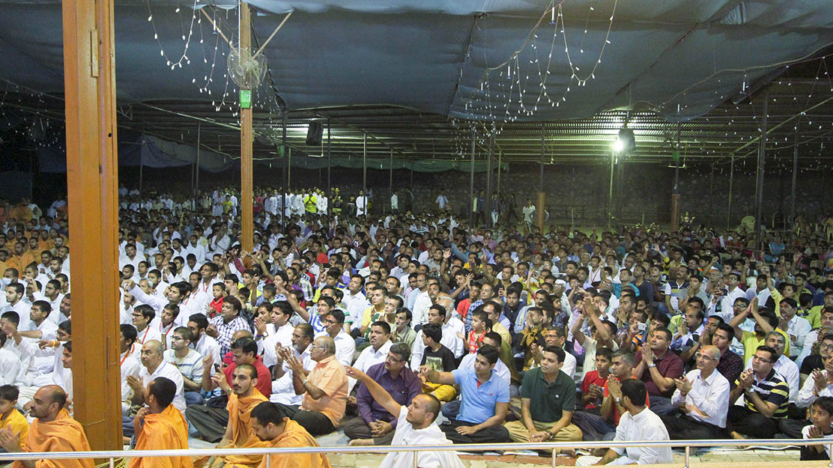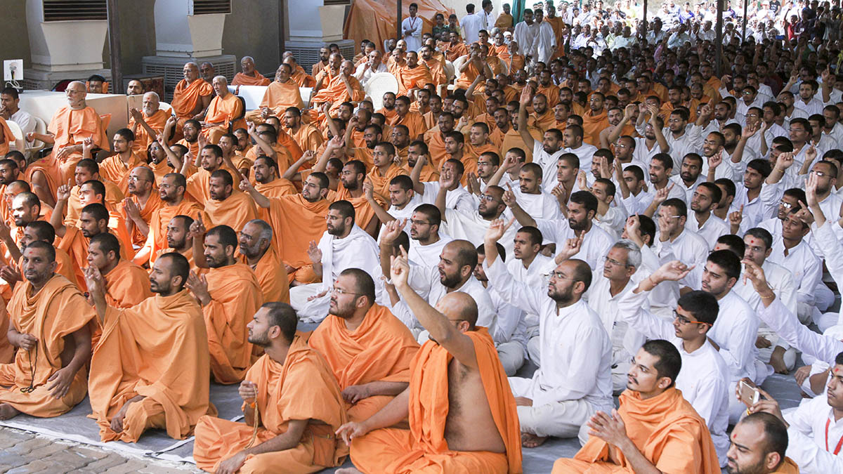 Swamishri arrives in the mandir grounds in the evening with Shri Harikrishna Maharaj