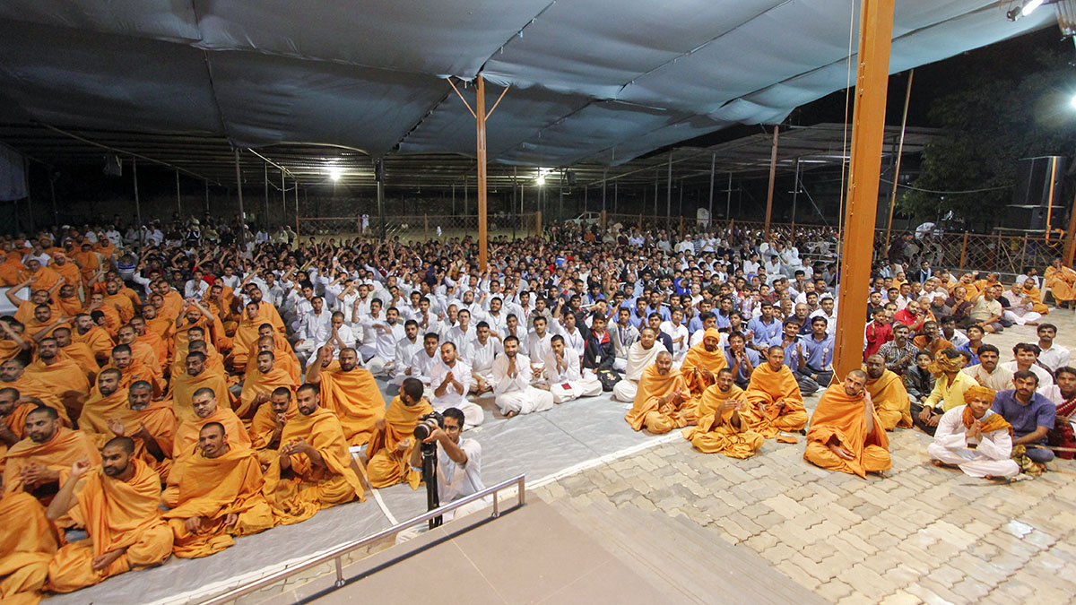 Swamishri arrives in the mandir grounds in the afternoon with Shri Harikrishna Maharaj