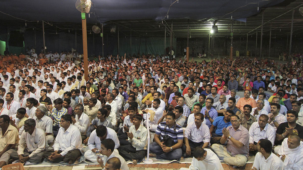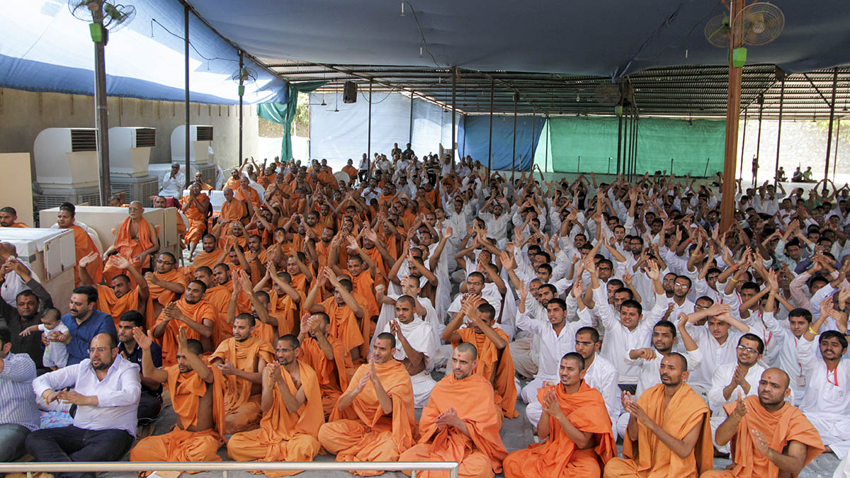 Sadhus and devotees doing darshan of Swamishri