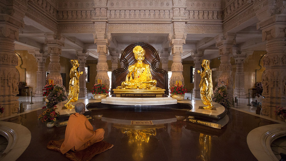 Param Pujya Mahant Swami engrossed in darshan of Bhagwan Swaminarayan, Aksharbrahman Gunatitanand Swami and Shri Gopalanand Swami, 6 Sep 2016