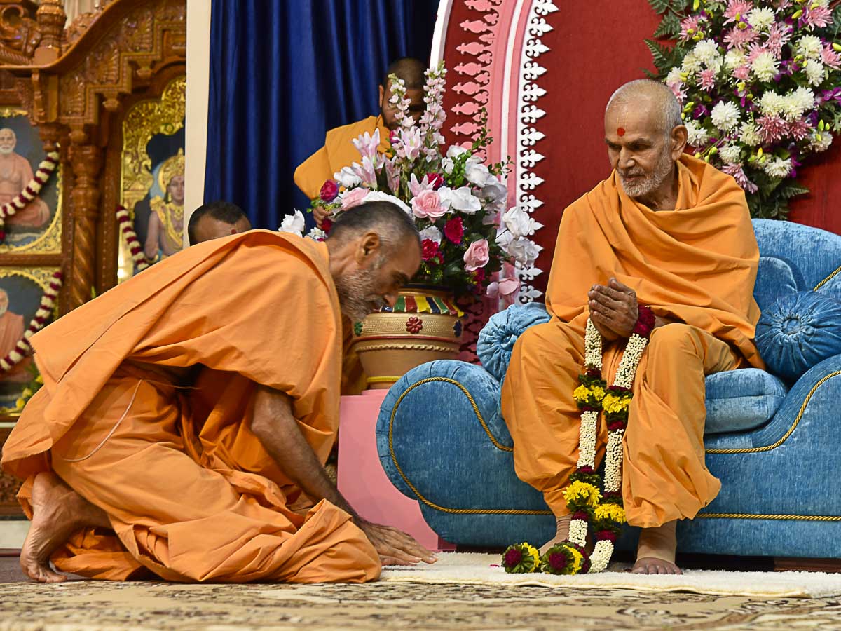 Vishwavihari Swami honors Param Pujya Mahant Swami with a garland, 7 Sep 2016