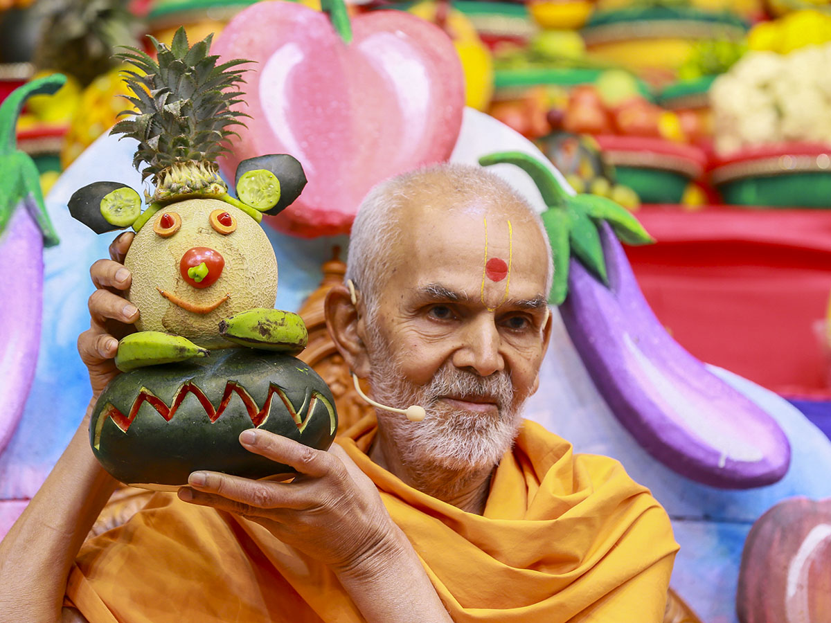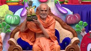 Param Pujya Mahant Swami sanctifies various fruits and vegetables offered in Thakorji's 'Haatdi' on Prabodhini Ekadashi, 11 Nov 2016