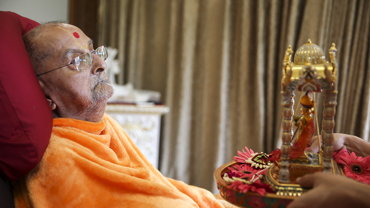 Swamishri engrossed in darshan of Shri Harikrishna Maharaj