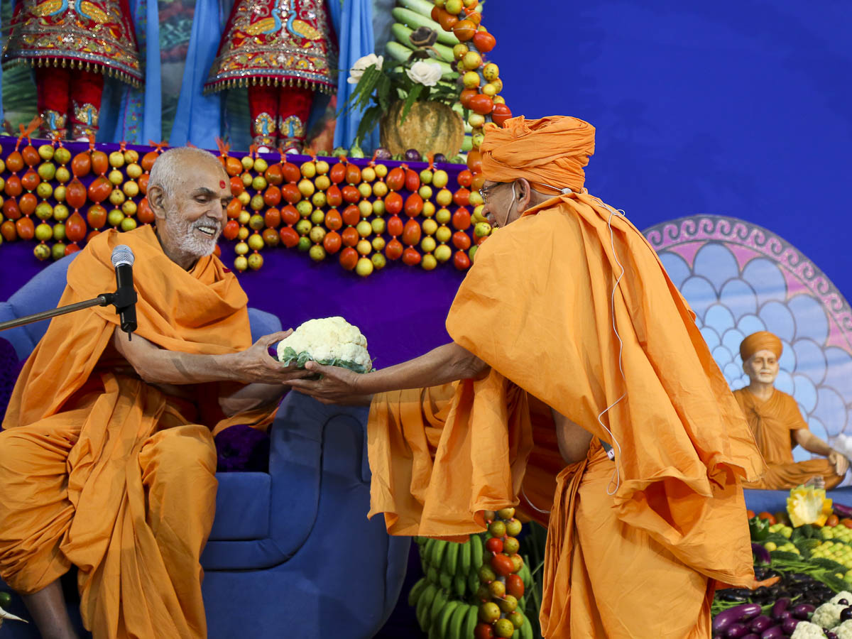 Param Pujya Mahant Swami sanctifies various fruits and vegetables offered in Thakorji's 'Haatdi' on Prabodhini Ekadashi, 11 Nov 2016