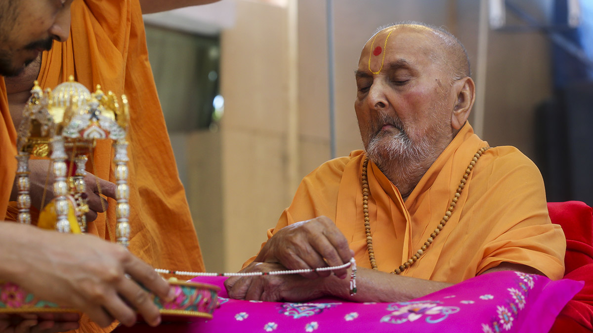 Swamishri blesses Pujya Bhaktipriya Swami (Pujya Kothari Swami)