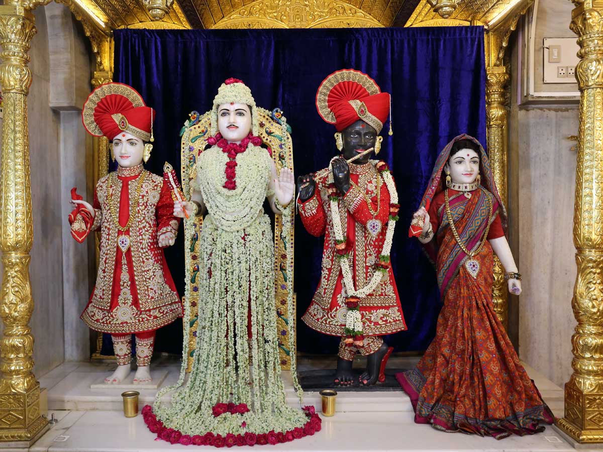 Pujya Swayampraksh Swami (Pujya Doctor Swami), Pujya Tyagvallabh Swami, Pujya Bhaktipriya Swami (Pujya Kothari Swami) and Pujya Ishwarcharan Swami doing darshan of puja, 19 Aug 2016