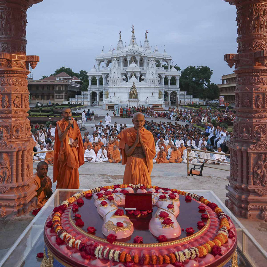 Param Pujya Mahant Swami performs Charnarvind sthapan vidhi on Brahmaswarup Pramukh Swami Maharaj's samadhi sthal, 24 Aug 2016