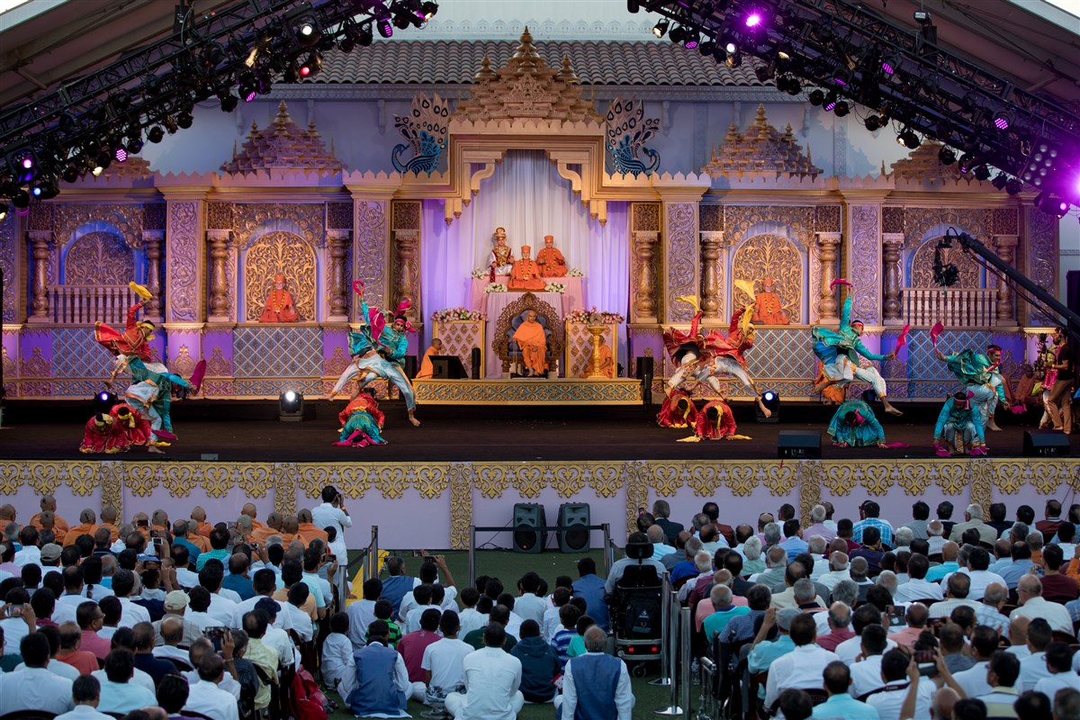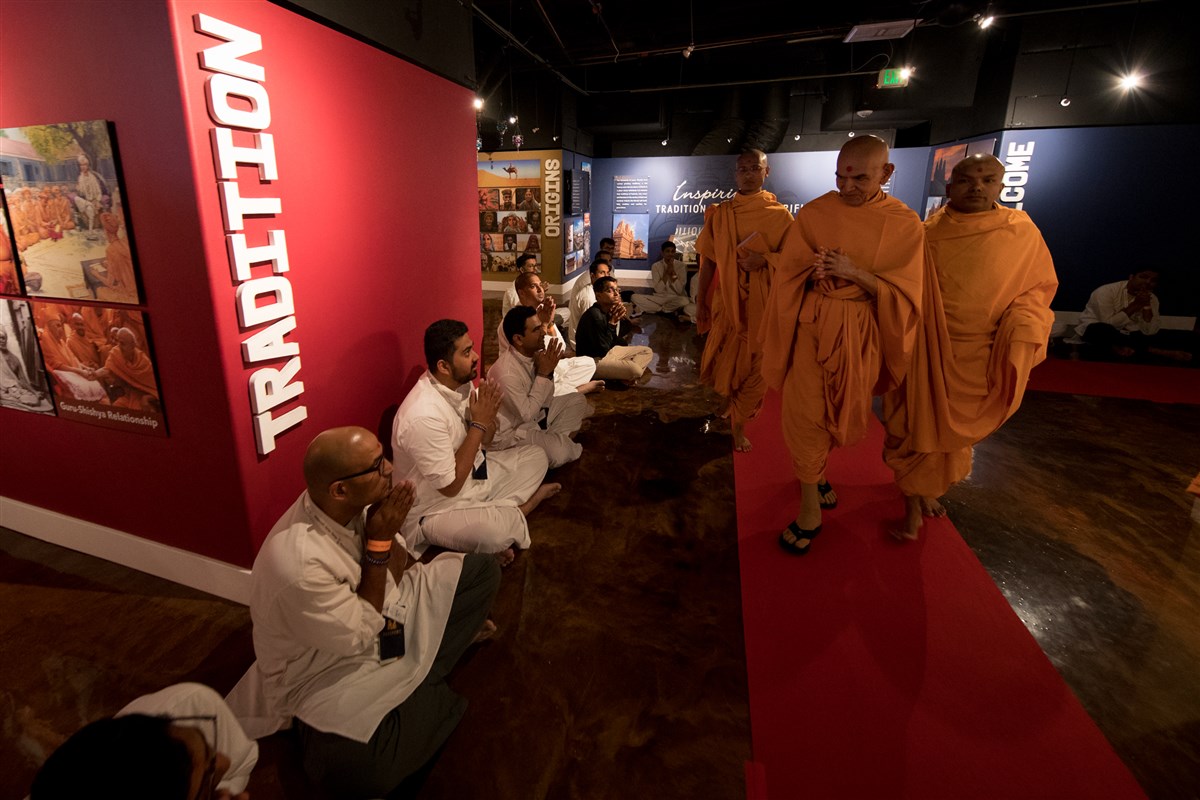 Param Pujya Mahant Swami Maharaj greets devotees with folded hands