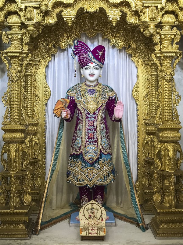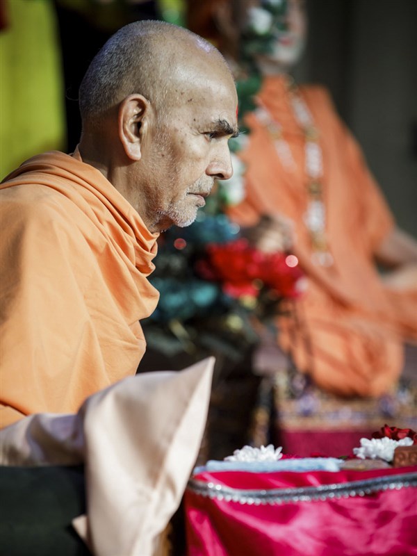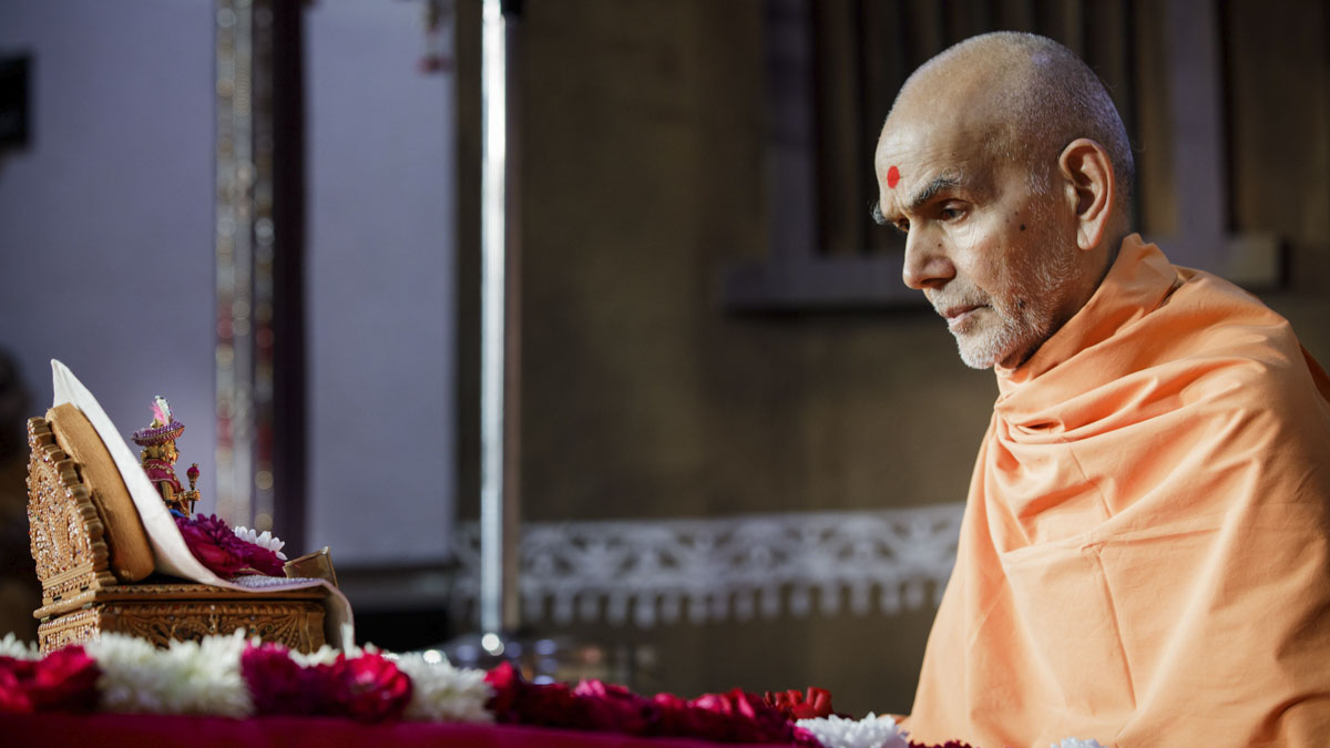 Param Pujya Mahant Swami Maharaj engrossed in darshan of Shri Ghanshyam Maharaj