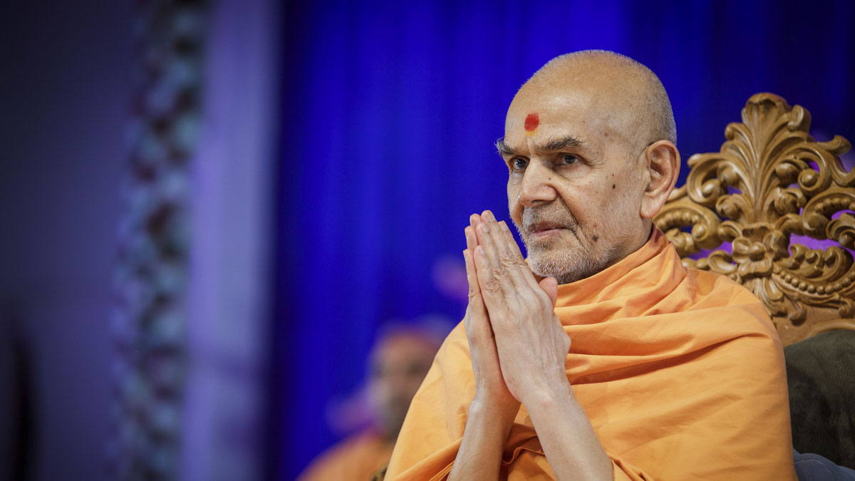 Swamishri greets devotees with 'Jai Swaminarayan'